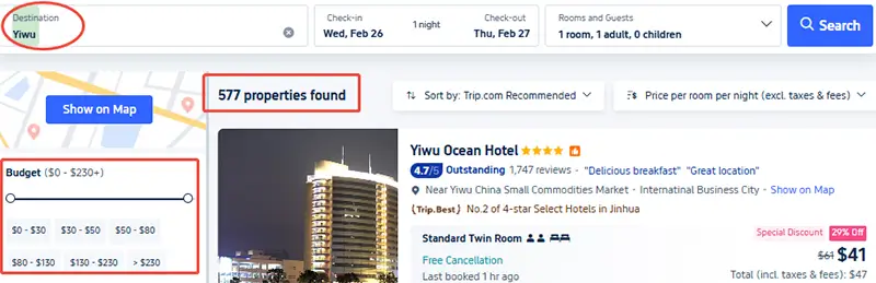 Trip.com and Tripadvisor are the most popular and convenient, offering hundreds of hotels from budget to luxury in Yiwu. Trip.com, however, has more options.