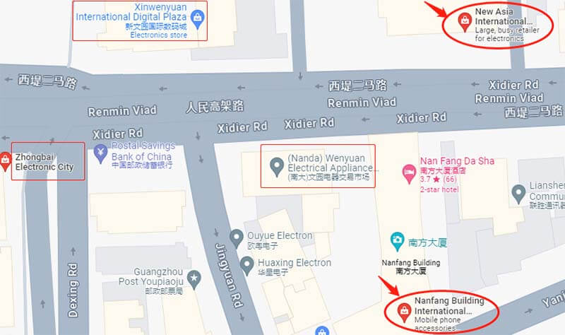 New Asia and Nanfang Building markets are the largest wholesale markets for mobile phones and accessories, as well as electronic digital products, in Guangzhou. Additionally, Xidi’er Rd is home to dozens of other wholesale markets specializing in mobile phones and digital electronics, such as: