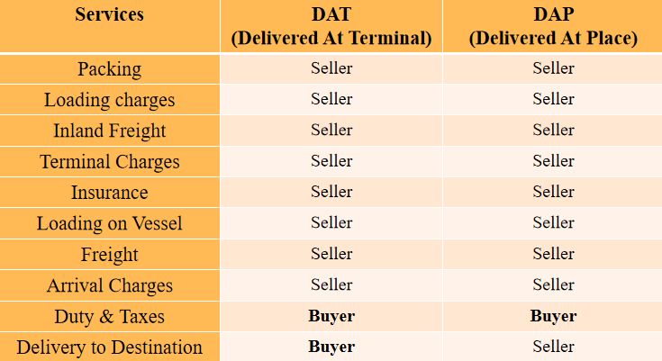 Thus, compared with DAT, the prominent difference is in the delivery point. DAT is at the port or terminal, while DAP is in a named location outside the facility. That is to say, under DAT, the buyers are responsible for transporting the goods from the delivery terminal to the final destination, while under DAP, they just need to wait for the goods at the destination.